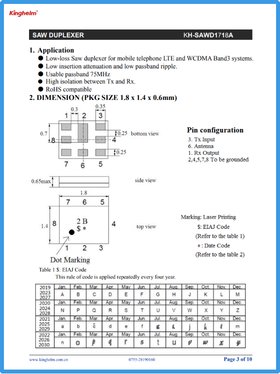 Kinghelm金航标 KH-SAWD1718A SAW双工器是一款针对LTE Band3和WCDMA Band3系统设计的射频组件。它通过其内部的滤波结构,在移动设备的发射和接收路径之间提供了必要的频率分离与信号隔离功能,是支撑FDD模式高效利用成对频谱资源的关键物理部件之一。其技术特点包括明确对应系统上下行的工作频段、符合常见设计要求的插入损耗与隔离度,以及适应现代制造需求的小型化封装。