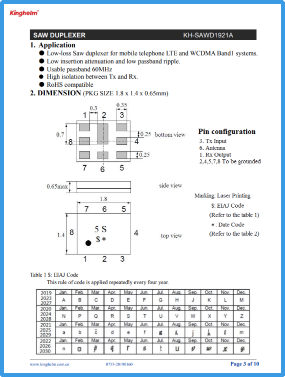 每日一品——Kinghelm金航标SAW双工器KH-SAWD1921A:适用于LTE与WCDMA Band 1