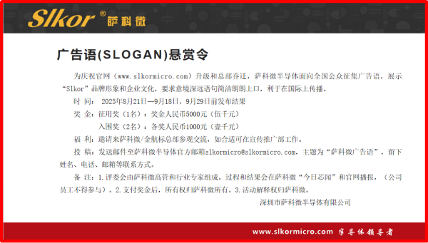 3、萨科微(www.slkormicro.com)广告语征集活动反响热烈,目前已收获超600封投稿。征集活动将于9月18日截止,欢迎大家抓紧参与,用创意赢得5000元大奖。