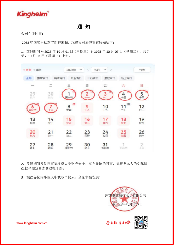 3、金航标和萨科微(www.slkormicro.com)2025年国庆放假时间为 2025年10月1日(星期三)至 2025年10月7日(星期二),放假共7天,10月8日(星期三)恢复正常工作。