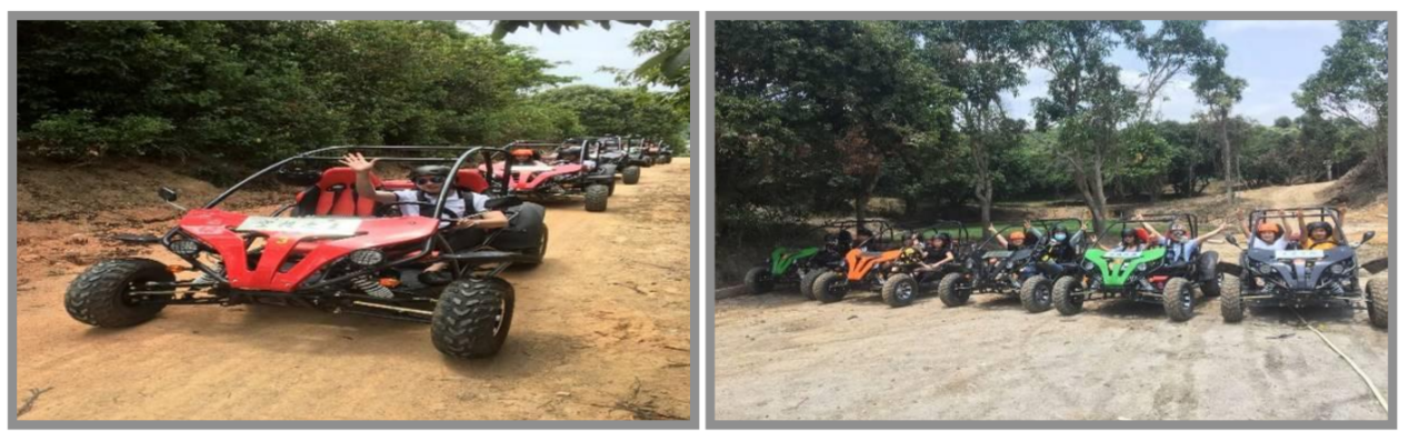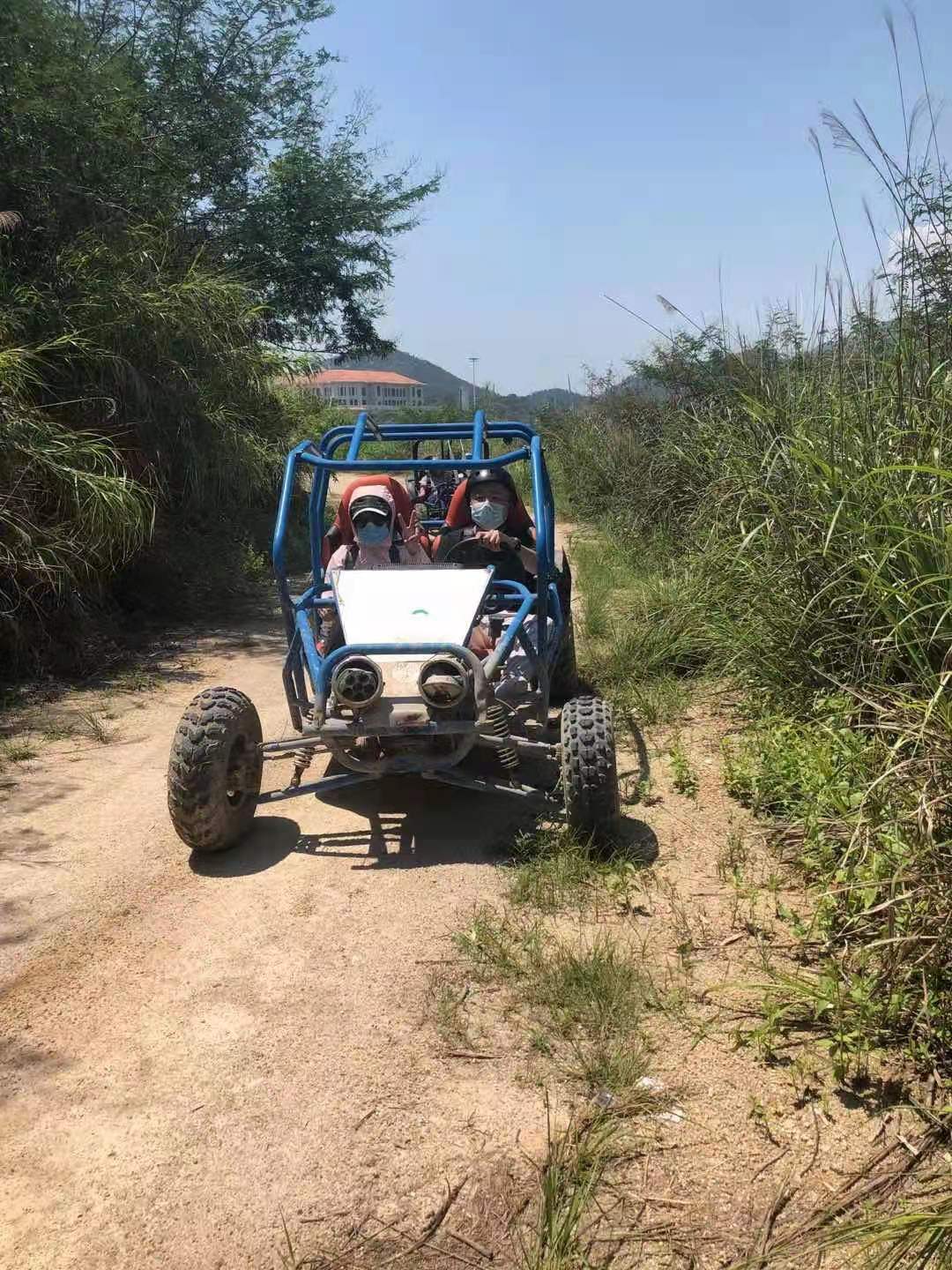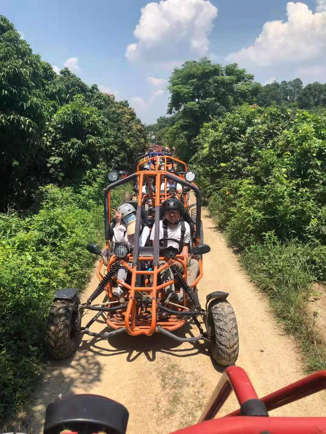 我们第一个项目越野车体验-目的地,丛林越野:利用营地本身的荔枝林展开各种地形的角逐,2 人一车,有 45 度爬坡,180度 漂移,石子路,多处 90 度急转弯。让金航标Kinghelm团队人员体验到了丛林越野的刺激快感,围绕着攀岩弯曲不平的山路,一圈又一圈,开足马力,那一刻,我感受到了大家完全释放的热情与愉悦,这也印证了我们团队文化:“玩就好好玩,干就加油努力干”!