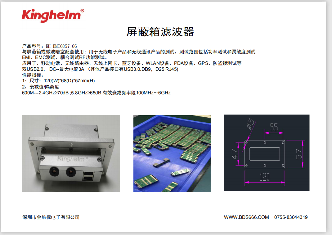 为了扩大业务范围增加销售额,金航标kinghelm公司(www.BDS666.com)不断研发新产品投入市场,推出的滤波器KH-EMI6857-6G,可以和微波暗室屏蔽箱等天线的检测调试产品配套使用。