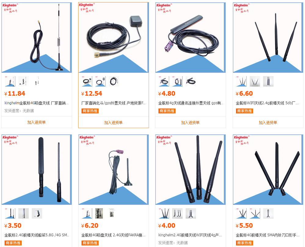 北斗卫星导航系统和GPS常见于汽车等,通常与各种内置和外置天线搭配使用,加强信号功率和稳定性。目前店铺上架的产品有金航标kinghelm公司研发生产北斗天线和模块,如KH1612北斗模块,应用于“两客一危”项目, 以及车载专用天线(BD/GPS天线、通讯天线) 另外还有物联网应用天线(吸盘、胶棒、内置陶瓷天线)等及相关的转接线、端子等配件。