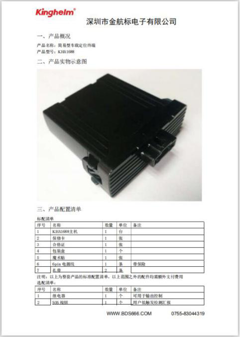 (99)金航标金航标公司为了巩固现有新能源汽车厂的合作关系,进一步的扩大在新能源汽车行业的市场份额,配合KH系列北斗天线连接线接插件等产品围绕新能源汽车客户服务,研发kinghelm品牌KH1688系列产品。金航标开始量产的新能源汽车简易定位产品KHA1688,该产品为基站定位、北斗BDS兼容GPS,双模定位可以自由热切换,采用高级ST意法半导体的mcu,符合部标808协议,停车自动休眠节电模式。为广大新能源汽车车主提供轨迹回放、电子定位、电子围栏、防盗报警,寻找车库车位、危险驾驶监控等功能,和车联网平台配合还可以发挥更大的作用。深圳市金航标电子有限公司,主要研发生产“kinghelm”品牌的汽车北斗天线GPS天线、天线连接线、导航定位产品中应用的微波射频连接器、北斗gps模块等(