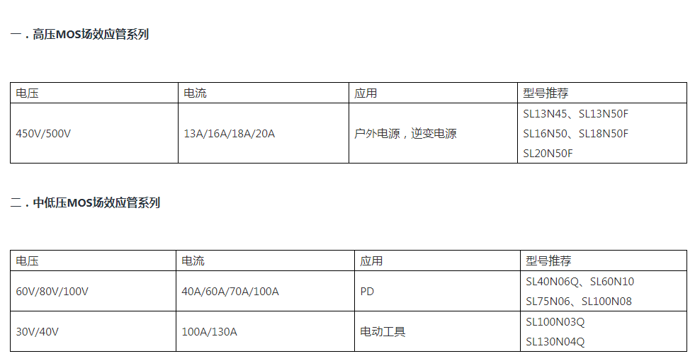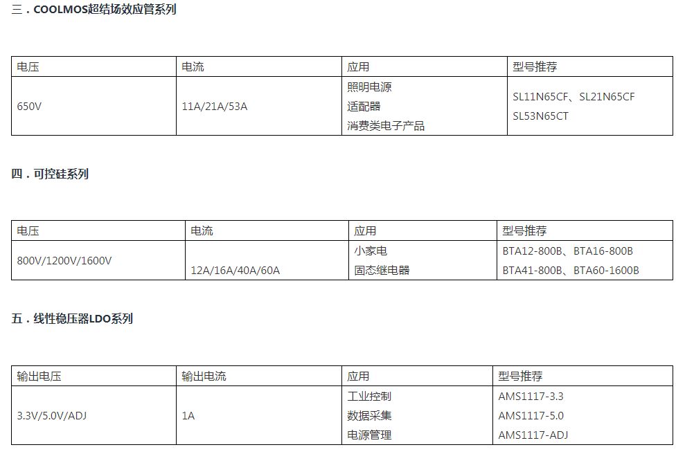 SL60T65FL、SL25T120FL、四.高压MOS场效应管系列、电压 电流 应用 型号推荐