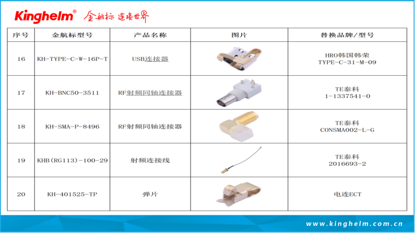 Kinghelm金航标(www.kinghelm.com.cn)从事无线信号收发、电子信号连接器及互连系统产品的设计、制造、销售和技术服务十多年,技术团队来自清华大学和电子科技大学,吸纳优秀海归人才,深耕微波射频技术领域,联合高校成立研究机构。金航标(www.kinghelm.net)获得了多项发明专利,已取得ISO9001认证和RoHS、REACH认证。IATF16949汽车质量体系认证,UL、TUV等认证在申请中。“金航标,连接世界”,从最初推出天线产品,包括北斗GPS双模天线、蓝牙、WiFi、Zigbee、NB-IoT、LORA、UWB,及配套的射频转接线;现在产品拓展到板与线的各种连接器、板端座子、接插件、信号开关系列;及汽车摩托车线束,工业、医疗、科研用特种线材,非标定制品等三大系列。金航标的兄弟公司萨科微半导体产品销往世界各地,服务超一万家客户,产品有二极管三极管、功率器件、电源管理芯片三大系列。萨科微近年来还推出霍尔传感器、ADC、BMS新产品,与金航标电子一起为电子整机产品公司提供配套服务。