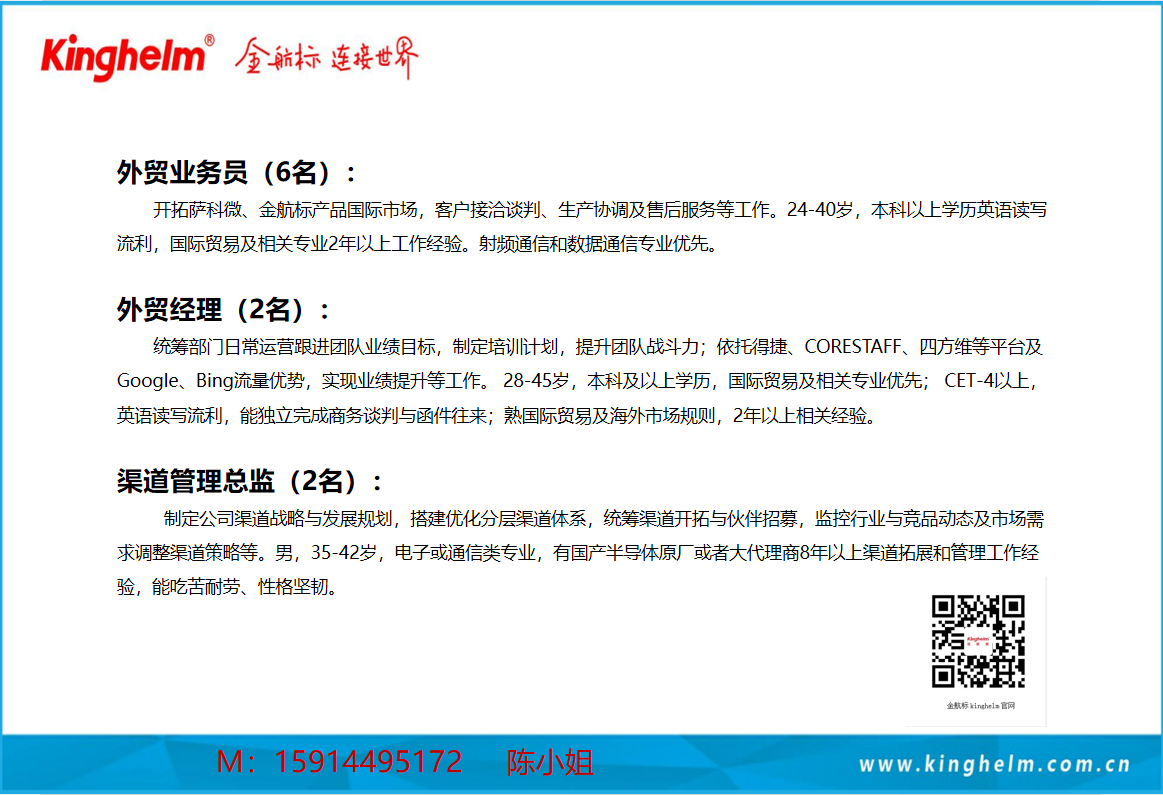 五千年华夏,因文化而赓续;千里江山,有连接则焕采。金航标,连接世界! 2007 年,金航标从深圳华强北启航,秉承 “内圣外王” 的东方智慧,内修技术之精微,外行连接之担当。 在全球产业协同的浪潮中,我们是界面背后的连接,以电磁波和连接器为媒介,确保信号链路稳定。从北斗导航的高精度天线,到智能汽车的可靠信号连接,已构建服务通信、汽车、工业、IoT 等领域的系列化产品,8000+SKU,是对复杂连接的精准解构;20000 + 全球客户,是信任的长期沉淀。 金航标,从来没有口号,而是可执行、可交付的体系化承诺。从设计、制造、检测到大批量产品交付,以标准化、系统化、流程化做支撑,以规模化、精细化提升性价比,让连接简单、灵活、可靠、敏捷。我们不懈追求高技术、高品质、高安全性,实验室里参数千次调校,生产线上工艺万遍打磨。产品无言,却会说话,每个细节,都有我们的承诺;以耐心对待复杂,以稳定回应期待。 金航标,文化为舵,产品为帆;金航标旗舰,扬帆世界!公司拥有 ISO9001 质量管理体系认证,符合欧盟 RoHS、REACH 标准,取得邓白氏认证,以国际语言与全球对话。 这份自信,源于金航标文化:守正,可以行稳致远;精进,保持日进一步;细节,是成败的关键;坚韧,是不怕挫折、一往无前。这些理念,都写进流程、融入血液,贯穿每一位金航标人的日常。员工生活好了,才能工作好。高管办公室都布置了雅致的茶室,让大家在紧张工作中松弛下来,迸发创意与创新,打造优质产品,带动公司持续高质量发展。 金航标汇聚清华大学、电子科技大学技术力量,联合深圳信息职业技术大学打造智能生产基地。柔性敏捷的产线、高效流转的中心仓库,铸就可靠、高效、精准的全球交付能力。 金航标立足中国,以开放之姿、稳健之步,行王者之道,连天下所需。客户的信任,是责任,更是使命,是刻在每个连接产品上的誓言。 金航标 —— 连接世界的中国力量!
