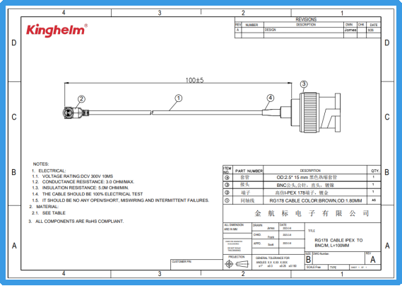 Kinghelm金航标KH-BNC-RG178IPEX-100规格书