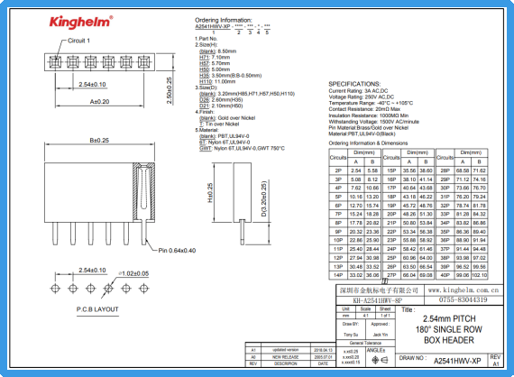 Kinghelm金航标 KH-A2541HWV-8P 采用 1×8P 单排结构,总孔位数为 8P,间距为常见的 2.54mm。这一规格在电子行业中应用广泛,无论是开发板、控制板,还是功能扩展模块,都能较为轻松地匹配使用。