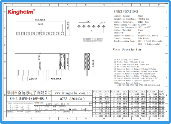 Kinghelm金航标KH-2.54FH-1X16P-H8.5规格书