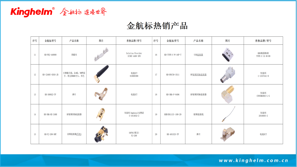 Kinghelm金航标(www.kinghelm.com.cn)从事无线信号收发、电子信号连接器及互连系统产品的设计、制造、销售和技术服务十多年,技术团队来自清华大学和电子科技大学,吸纳优秀海归人才,深耕微波射频技术领域,联合高校成立研究机构。金航标(www.kinghelm.net)获得了多项发明专利,已取得ISO9001认证和RoHS、REACH认证。IATF16949汽车质量体系认证,UL、TUV等认证在申请中。“金航标,连接世界”,从最初推出天线产品,包括北斗GPS双模天线、蓝牙、WiFi、Zigbee、NB-IoT、LORA、UWB,及配套的射频转接线;现在产品拓展到板与线的各种连接器、板端座子、接插件、信号开关系列;及汽车摩托车线束,工业、医疗、科研用特种线材,非标定制品等三大系列。金航标的兄弟公司萨科微半导体产品销往世界各地,服务超一万家客户,产品有二极管三极管、功率器件、电源管理芯片三大系列。萨科微近年来还推出霍尔传感器、ADC、BMS新产品,与金航标电子一起为电子整机产品公司提供配套服务。