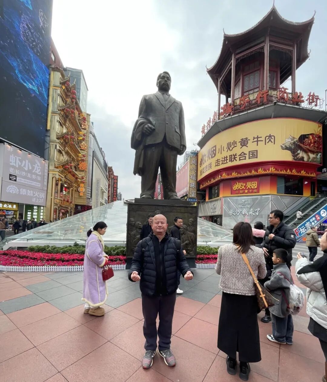 步行街很热闹,人头攒动。黄兴雕像非常威猛。