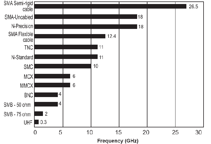 RF连接器的上限工作频率决定其在高频信号传输中能保持可靠阻抗匹配、低损耗和稳定电气性能的能力。图表展示了多种常见射频连接器在典型条件下的最高工作频率,能够直观看出不同连接器的电气结构、机械尺寸和精度对其带宽性能产生明显影响。