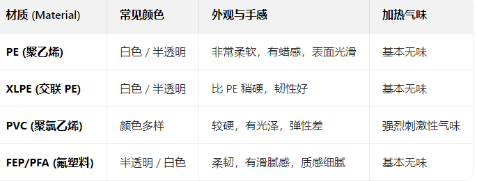 在实际工程、采购或生产现场中,如果没有产品规格书或实验室条件,快速判断电缆或连接器绝缘层材料是非常关键的技能。虽然最准确的方法仍然是查阅产品技术资料或进行专业测试(如介电常数测试、红外光谱分析、燃烧测试等),但在现场条件有限的情况下,常用的“看、摸、闻”三步法能够帮助工程师初步识别绝缘层材质,特别是在 PE、XLPE、PVC、FEP/PFA 等常见材料之间做出有效区分。