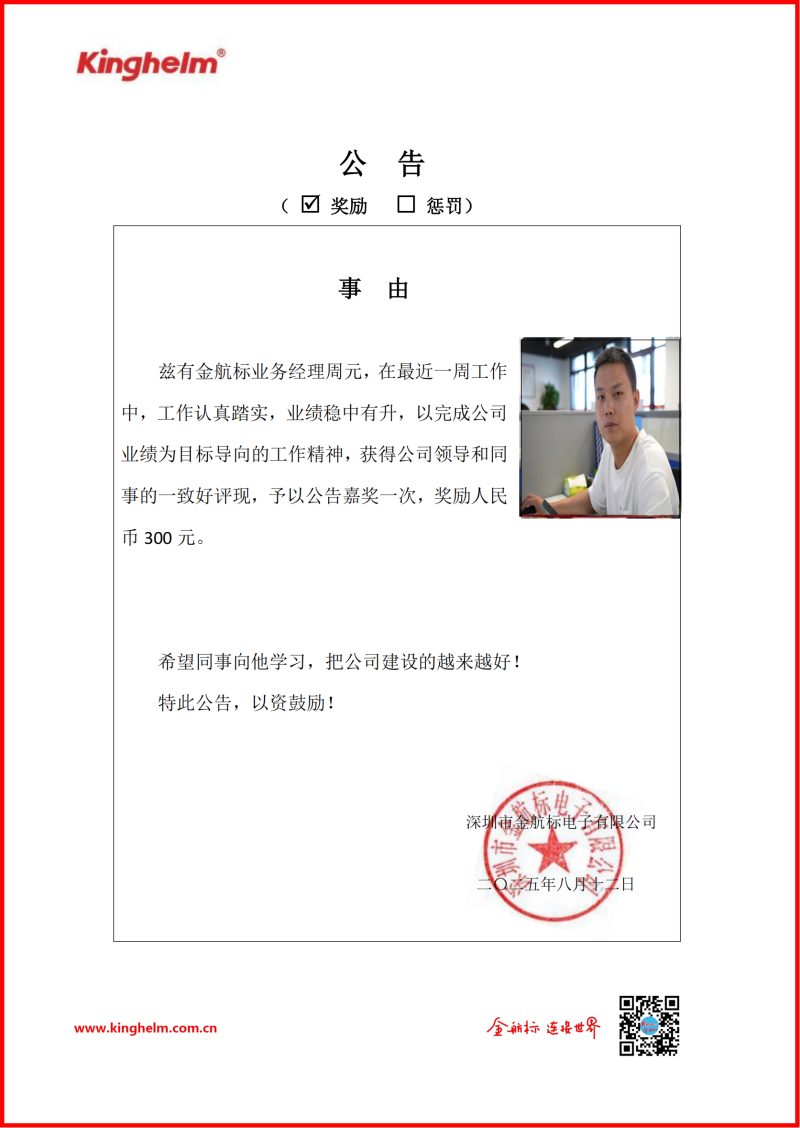 2025年08月11日到2025年08月16日,金航标(www.kinghelm.net)/萨科微(www.slkoric.com)“每周之星”经过领导和同事们评比,获奖的是金航标业务经理周元,在最近一周工作中,工作认真踏实,业绩稳中有升,以完成公司业绩为目标导向的工作精神,获得公司领导和同事的一致好评现,予以公告嘉奖一次,奖励人民币 300 元。
