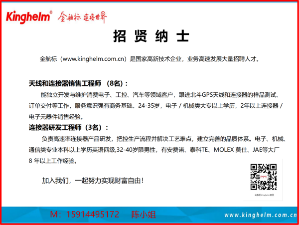 能独立开发与维护消费电子、工控、汽车等领域客户,跟进北斗GPS天线和连接器的样品测试、订单交付等工作,服务意识强有商务基础。24-35岁,电子/机械类大专以上学历,2年以上连接器/电子元器件销售经验。