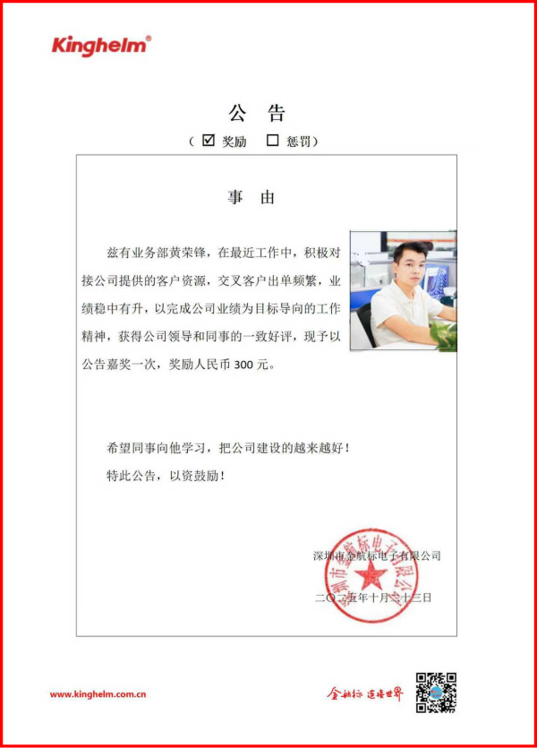 2025年10月20日到2024年10月25日,金航标(www.kinghelm.net)/萨科微(www.slkoric.com)“每周之星”经过同事们评比,这周“每周之星”是萨科微业务部黄荣锋,在最近工作中,积极对接公司提供的客户资源,交叉客户出单频繁,业绩稳中有升,以完成公司业绩为目标导向的工作精神,获得公司领导和同事的一致好评,现予以公告嘉奖一次,奖励人民币300元。