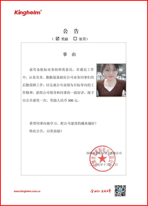 2025年12月01日到2025年12月06日,金航标(www.kinghelm.net)/萨科微(www.slkoric.com)“每周之星”经过同事们评比,获奖的是金航标业务助理黄意民,在最近一周工作中,,认真负责、勤勤恳恳做好公司业务同事们的后勤保障工作,以完成公司业绩为目标导向的工作精神,获得公司领导和同事的一致好评,现予以公告嘉奖一次,奖励人民币300元。