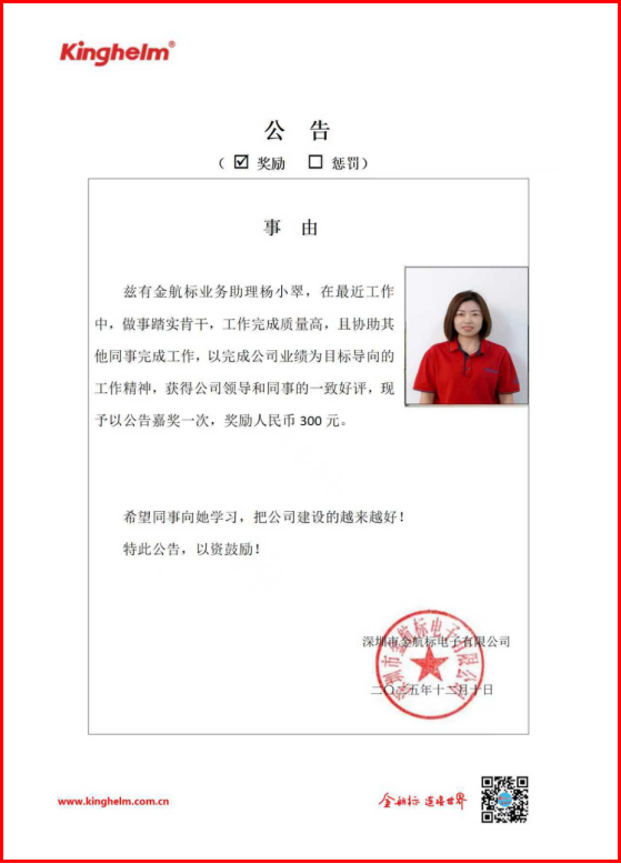 2025年12月08日到2025年12月12日,金航标(www.kinghelm.net)/萨科微(www.slkoric.com)“每周之星”经过同事们评比,金航标/萨科微的“每周之星”是金航标业务助理杨小翠,在最近工作中,做事踏实肯干,工作完成质量高,且协助其他同事完成工作,以完成公司业绩为目标导向的工作精神,获得公司领导和同事的一致好评,现予以公告嘉奖一次,奖励人民币300元。