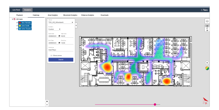 从 2020 年 8 月开始,位于东京日本桥的 TDK 总部就在使用 VENUE 对员工进行接触者追踪试验。员工们携带安装有一款特殊应用程序的智能手机,并将他们在楼层的位置和移动轨迹与匿名身份识别信息结合在一起。结合室内结构对人的位置进行分析可以更好地跨越墙壁或其他障碍物来识别直接接触者并排除假接触者。如果发现了某位员工感染,将会分析数据以识别出过去两周内与这名员工有过直接接触的人员,并将会采取要求相关人员居家隔离等措施。追踪接触者的过程是自动完成的,并针对复杂的室内空间进行了优化。