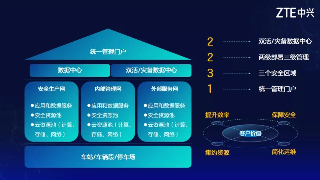 中兴通讯城轨云技术架构由一个平台(云管平台)、两个中心(生产中心、灾备中心)和三张网络(安全生产、内部管理和外部服务)组成。云管平台对两个中心三张网络的计算、存储、网络和安全等资源统一管理;两个中心采用双活架构设计,保证业务连续性;三张网络承载城轨交通的全部业务系统。中兴通讯城轨云支撑运营生产信息、乘客服务信息、企业管理信息三大业务系统,充分运用云计算、大数据等先进理念和技术,按照“集约高效、共享开放、安全可靠、按需服务”的原则,实现基础设施共建共用、信息系统整体部署、数据资源汇聚共享、业务应用有效协同,开展大数据开发利用,为地铁管理和公共服务提供有力支持,提高为民服务水平,提升用户现代治理能力,助力城轨智能化、智慧化发展。
