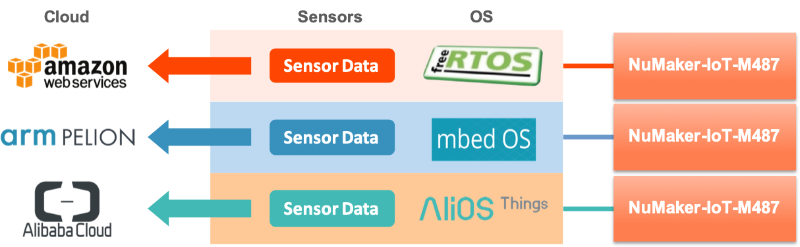 新唐 NuMaker-IoT-M487 平台支持多种嵌入式实时操作系统 (Real-time Operating System, RTOS),包含 Alibaba Alios, Amazon FreeRTOS, Arm mbed。客户可选择不同的 RTOS 并快速桥接至不同的云端服务,例如:Alibaba Cloud, Amazon Web Services (AWS), Arm Pelion。