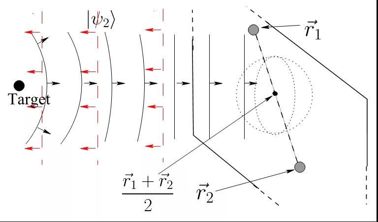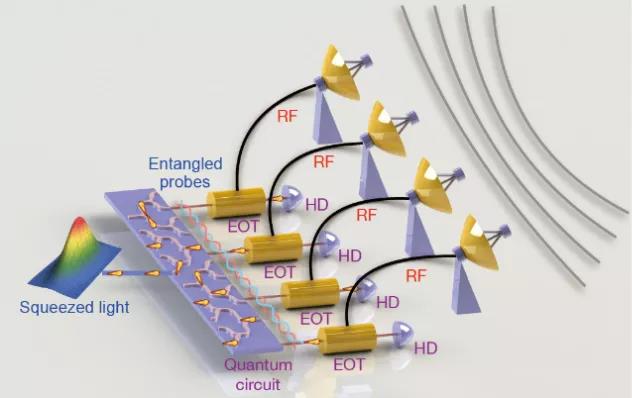 量子探测不但可以利用单个探测器进行测量,而且可以组网共同完成探测。2020年4月,亚利桑那大学研究者提出一种量子探测新方法,将分布式量子传感器互联形成量子传感器网络(图6),如用于微波信号到达角估计,可突破传统微波雷达回波到达角估计精度的性能瓶颈,实现到达角估计精度超过“量子标准极限”,为高精度定位、成像等应用提供了新的技术途径。