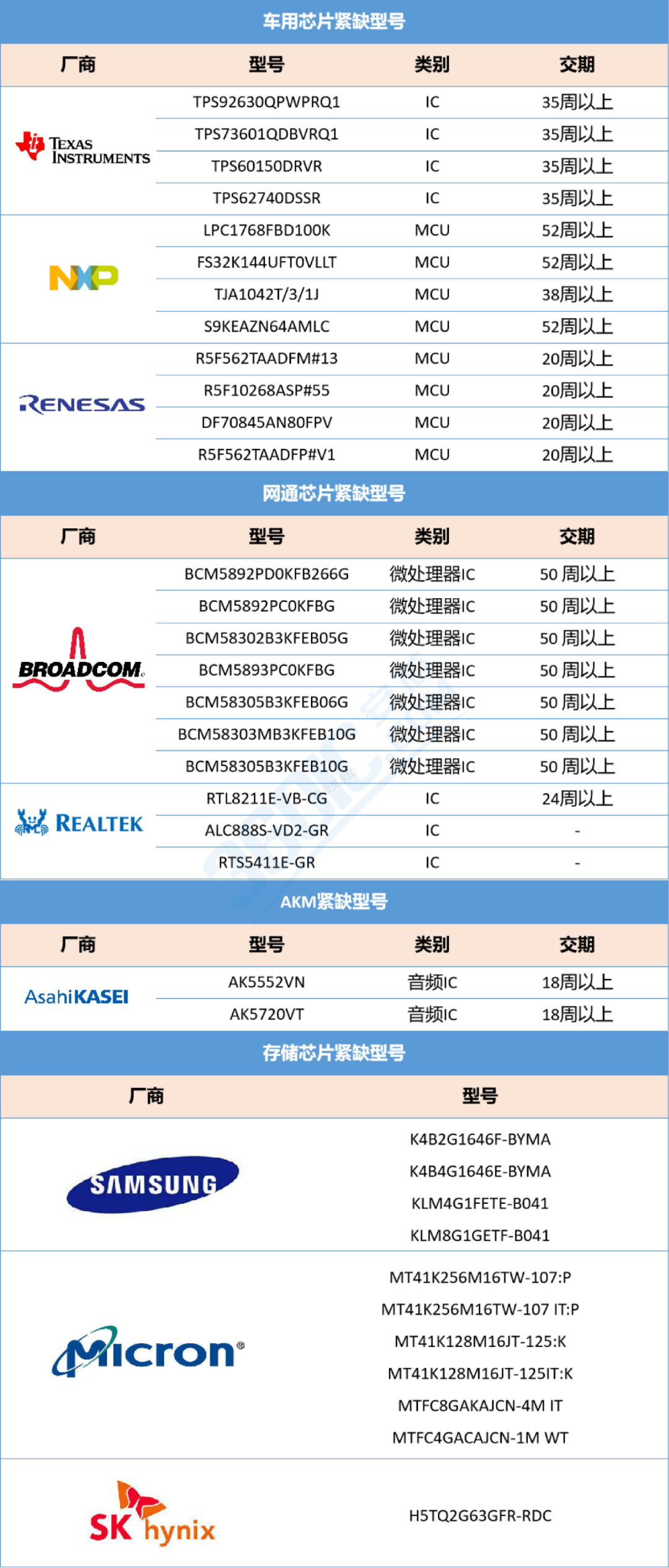 汽车行业:从之前德州寒潮引发的原厂停工,到近日瑞萨突发的火灾,今年车用芯片大厂好难。瑞萨受灾产能66%为汽车用芯片,也导致现在瑞萨、NXP、TI的汽车芯片再次疯涨。另外,本次受灾工厂也是AKM的代工厂,目前AKM代工未受影响,但受火灾影响,AKM询价也有一定增加。