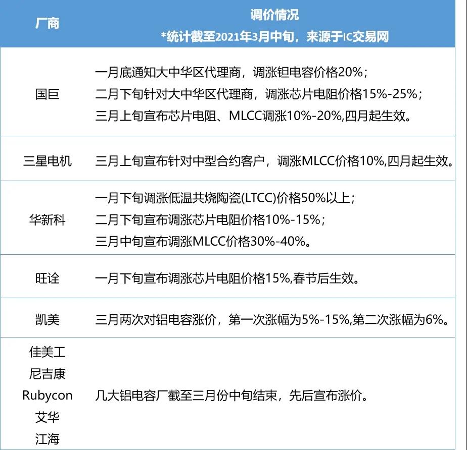 被动元件虽然未受大缺货影响,但各大厂商连续涨价,交货期也在延长。接下来的4月,国巨旗下聚合物钽电容将针对欧美客户合约价调升10%至20%,这也意味国巨所有主力产品线全面调涨;三星则将针对中型合约客户调涨MLCC价格,平均调涨幅度达10%,利润愈低的规格,调整幅度愈大。