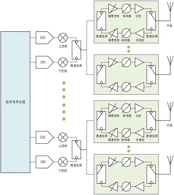 5G基站的由于广泛采用了Massive MIMO技术,其内部集成的天线采用的振子数量很多,另外集成了收发机单元,因此也称作有源天线阵列单元(AAU)。其内部结构原理图和产品形态如下图所示。