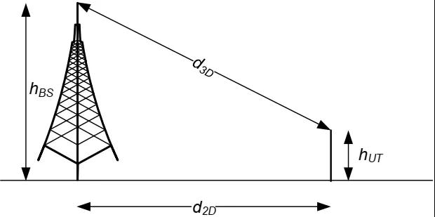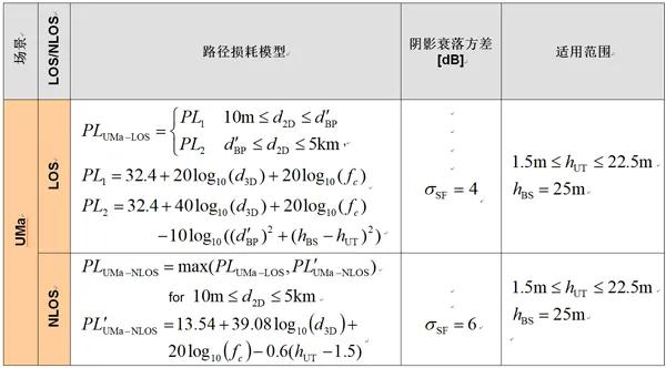 3GPP TR 38.901给出了室内热点办公区(InH-Office)、城市微蜂窝街道(UMi-Street Canyon)、城市宏蜂窝(Uma)、农村宏蜂窝(RMa)4种场景,每类场景又分非视距(NLOS)和视距(LOS)场景共八种传播模型。本文选取了城市宏站Uma-LOS/NLOS场景下路径损耗模型。其中fc工作频率(GHz),hBS基站天线有效高度(m),hUT移动台天线有效高度(m),d2D基站与移动台水平距离(m),d3D基站天线与移动台天线直线距离(m)。