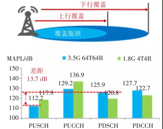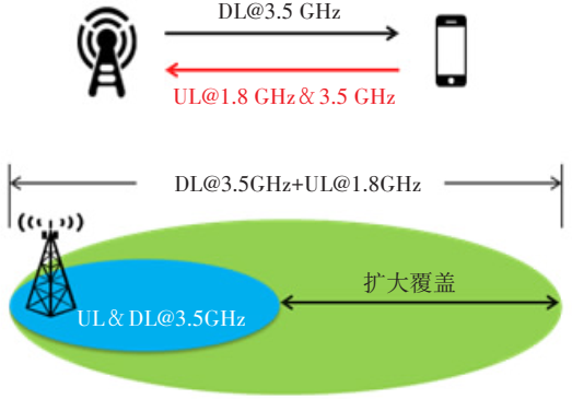 从第4.2节的计算结果可以看到,3.5 GHz频段5G NR上行覆盖受限,主要受终端功率受限影响,考虑到未来5G推出后的一段时间内上下行业务速率要求仍存在不对称的情况(下行速率要求远高于上行),为保持现有网络结构不变、减低建网成本,使得运营商能在4G现网站点上快速叠加部署5G,可采用上下行解耦(SUL)的方式解决存在上行覆盖瓶颈的问题。即上行利旧LTE设备,重耕1.8 GHz FDD部分带宽为5G NR提升覆盖,下行则在3.5 GHz频段部署5GNR。
