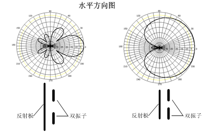 图1-3 在直线阵的一侧加反射板实现水平定向原理(以带反射板的二半波振子垂直阵为例)