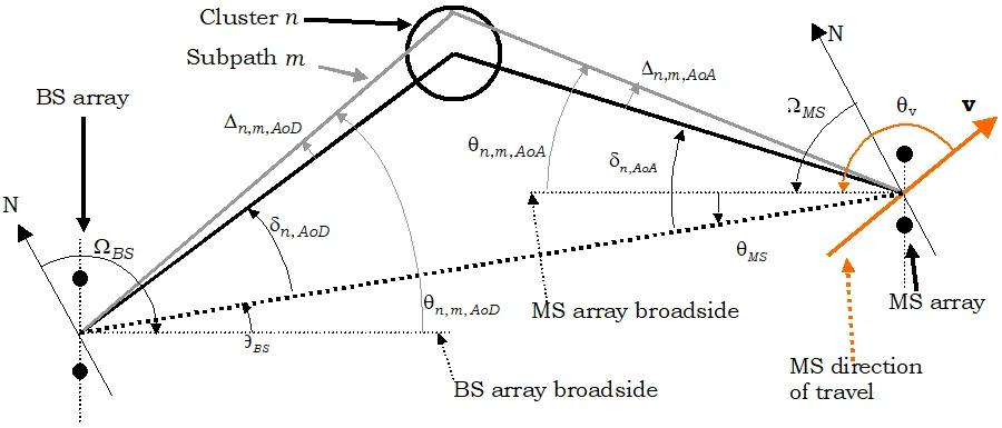 LTE多天线技术的引入为无线资源增加了空间维的自由度,同时对无线信道模型提出了新的要求。在3GPP TR 25.996中提出了空间信道模型(Spatial Channel Model, SCM),该模型适用于带宽是5 MHz和载频在2 GHz左右的系统,最大多径个数为6。LTE系统要求无线信道可以支持到20 MHz,因此,在技术报告36.803中使用了SCME(SCM Extention)模型,将信道带宽扩展到20 MHz,最大多径个数支持到9。其中,eNB和UE间的无线传输特性是个时变函数,它随着天线配置,天线方向角,天线相关性以及散射环境等变化而变化,如下图所示。
