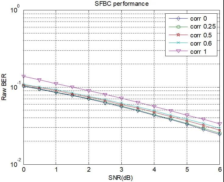 双极化天线和单极化天线(天线间距10λ)的无线性能差异主要取决于基站天线的相关系数。当相关系数为0时,表明天线间相对独立,相关性低。当相关系数为1时,表明天线间具有强相关性。当系统采用发射分集模式(如SFBC),接收分集和MIMO双流方式时,低相关性天线的无线性能要优于高相关性天线的性能。下图是相关系数分别为0.25,0.5,0.6和1的SFBC性能仿真结果。从仿真结果来看,当相关系数为0.25时,其性能基本不受影响(和相关系数为0相比)。相关系数为0.5和0.6的SFBC性能下降0.3dB至0.4dB左右。