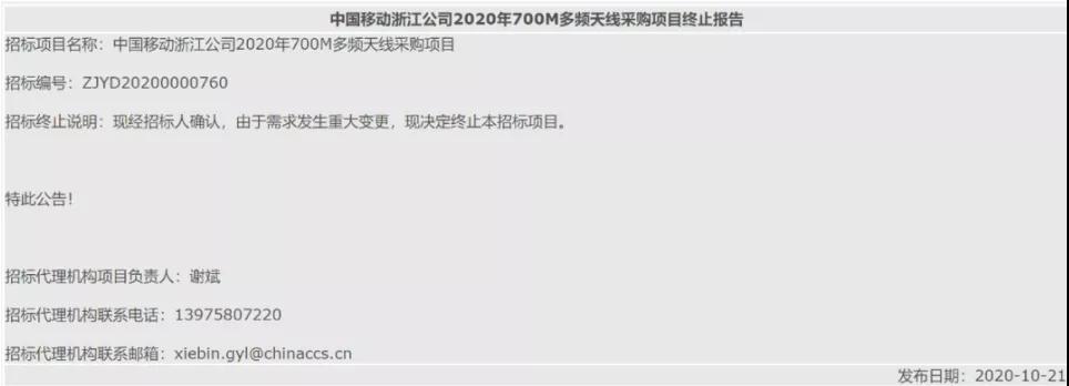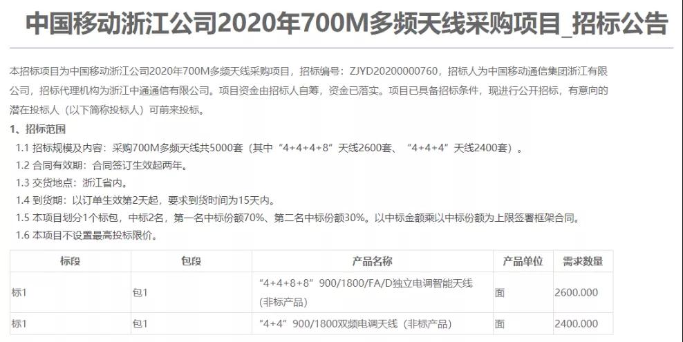 而随后,中国移动集团浙江公司启动2020年700M多频天线采购项目的招标。