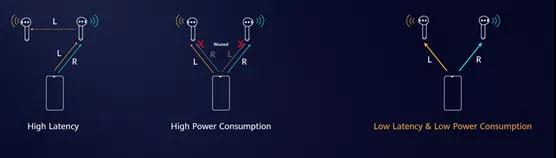 华为通过自研的双通道同步传输技术解决延迟和功耗上的问题,传统TWS耳机同时将左右声道传输至主耳机,然后再转发给副耳机,这样引发了转发效率低、延迟高、断连以及高功耗的问题。此外由于蓝牙和2.4GHz的Wi-Fi使用同一频段,因此很容易互相干扰。该技术让两个耳机分别接受左右声道的通信,降低了50%的功耗,与蓝牙5.2中的LE同步信道类似。