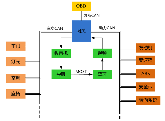 CAN总线为了便于管理和控制,一般按功能需求进行划分,传统汽车主要分动力和车身两大块,车身总线采用低速,动力采用高速。还留有一路专门做诊断的CAN连到车内的OBD接口。另外,由于现在车内导航、影音的需求太大,CAN总线没办法提供给视频数据如此高的传输速率,所以在车载导航和娱乐系统中,一般采用速率可达22.5Mb/s 的MOST总线或其他类似的高速总线。不同总线网络之间通信,全部依靠网关转发报文。因此,网关也基本是车内总线中最重要的部件,重要性就相当于人体的脊椎。各厂商的架构根据其需求会略有不同,但总体上都是这种模式。