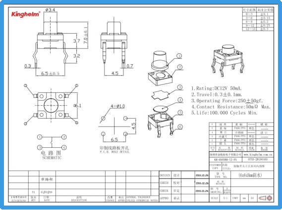 轻触开关在电子设备的输入体系中经常处于不显眼的位置,但它们在产品长期运行中的作用却极为关键。本文聚焦Kinghelm金航标型号为 KH-6X6X8H-TJ-FS 的轻触开关,以其 6×6mm 的开关本体宽度与 8mm 高度为基础,结合 DC12V 50mA 的额定参数、0.3±0.1mm 的触发行程、250±50gf 的操作力度、50mΩ Max 的接触电阻以及 ≥100,000 次的使用寿命,对其在紧凑结构、交互一致性与使用可靠性上的特性展开深入讨论。文章面向行业工程师及资深产品开发人员,从元器件选型、结构设计、耐久性验证到典型场景应用提供系统化视角。