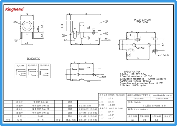 Kinghelm金航标KH-PJ-208B 是一个通孔式2.5mm耳机插座,主体结构设计适用于常规PCB插件焊接。该插座的额定电气参数为DC 30V 0.5A,接触电阻≤0.03Ω,绝缘电阻≥100MΩ(DC 250V测试条件),可承受500VAC耐压测试。插入力与拔出力介于3N至20N之间,寿命测试周期达到5,000次插拔。产品质量为0.36克,便于大批量包装交付及生产线管理。包装方式为袋装,适合手工装配或小规模插件工艺。