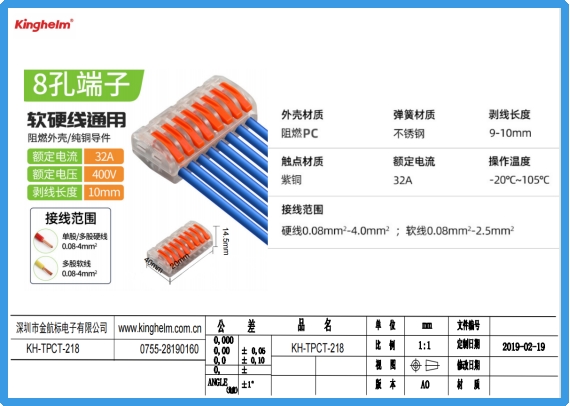 在导线适配方面,产品支持 软硬线通用,这点对于现场布线极为重要。施工人员常会面临不同线材混合使用的情况:硬线用于固定配电,软线多见于照明设备、端子引线、仪表连接等位置。KH-TPCT-218 支持的线径范围为: