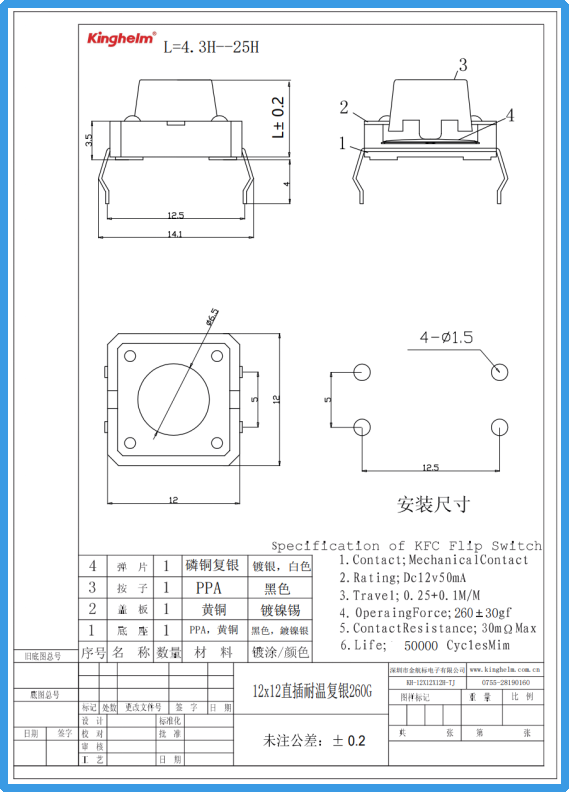 在电子元器件领域,轻触开关凭借其小巧体积、灵敏响应和可靠性能,成为消费电子、工业设备、智能家居等领域的核心控制元件。金航标(Kinghelm)推出的KH-12X12X12H-TJ轻触开关,以12mm×12mm×12mm的紧凑尺寸、单刀单掷的电路结构及50mA/12V的电气参数,重新定义了轻触开关的性能边界。本文将从产品核心优势、环境适应性、应用场景扩展三个维度,解析这款产品如何以“小而精”的设计理念满足多样化需求。