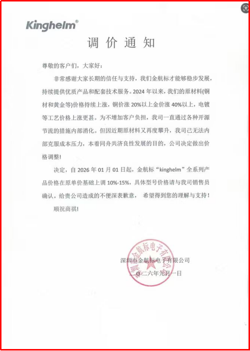 调 价 通 知丨金航标“kinghelm”全系列产品价格上调10%-15%!2026年1月1日起施行!