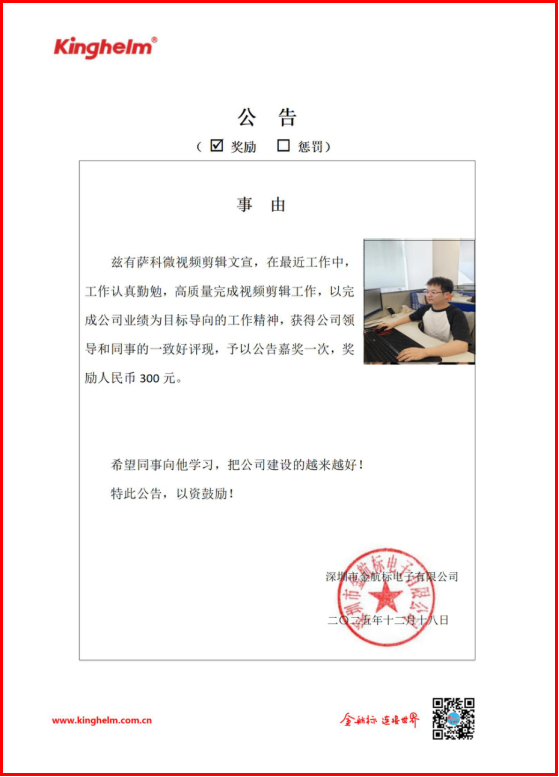 2025年12月15日到2025年12月20日,金航标(www.kinghelm.net)/萨科微(www.slkoric.com)“每周之星”经过同事们评比,这周“每周之星”是萨科微视频剪辑文宣,在最近工作中,工作认真勤勉,高质量完成视频剪辑工作,以完成公司业绩为目标导向的工作精神,获得公司领导和同事的一致好评现,予以公告嘉奖一次,奖励人民币 300 元。