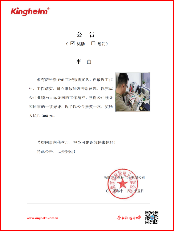 2025年12月22日到2025年12月26日,金航标(www.kinghelm.net)/萨科微(www.slkoric.com)“每周之星”经过同事们评比,金航标/萨科微的“每周之星”是萨科微FAE工程师熊文达,在最近工作中,工作踏实,耐心细致处理售后问题,以完成公司业绩为目标导向的工作精神,获得公司领导和同事的一致好评,现予以公告嘉奖一次,奖励人民币300元。