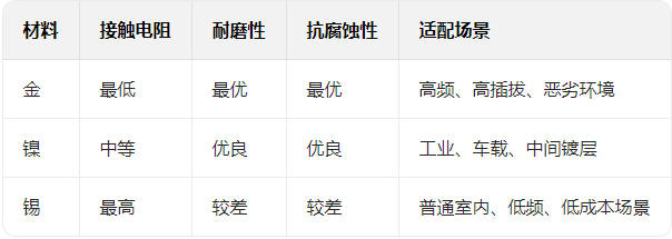 天线连接器座子的金、镍、锡等电镀材料,对电气性能和寿命有何影响?