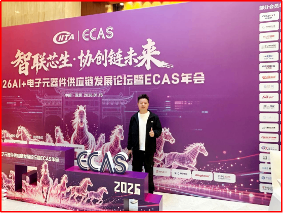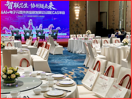5、1月15日,“智联芯生·协创链未来”2026AI+电子元器件供应链发展论坛暨ECAS年会在深圳星河丽思卡尔顿酒店举行,金航标(www.kinghelm.net)和萨科微(www.slkoric.com)赞助数百份礼品袋,金航标业务总监杨波、萨科微业务总监孙高飞代表参会!