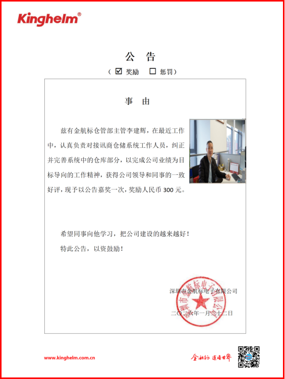 2026年01月19日到2026年01月23日,金航标(www.kinghelm.net)/萨科微(www.slkoric.com)“每周之星”经过同事们评比,这周“每周之星”是金航标仓管部主管李建辉,在最近工作中,认真负责对接讯商仓储系统工作人员,纠正并完善系统中的仓库部分,以完成公司业绩为目标导向的工作精神,获得公司领导和同事的一致好评,现予以公告嘉奖一次,奖励人民币300元。