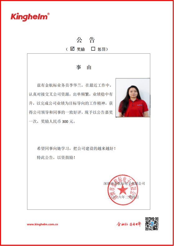 2026年02月02日到2026年02月06日,金航标(www.kinghelm.net)/萨科微(www.slkoric.com)“每周之星”经过同事们评比,这周“每周之星”是金航标业务员李华兰,在最近工作中,认真对接交叉公司资源,出单频繁,业绩稳中有升,以完成公司业绩为目标导向的工作精神,获得公司领导和同事的一致好评,现予以公告嘉奖一次,奖励人民币300元。