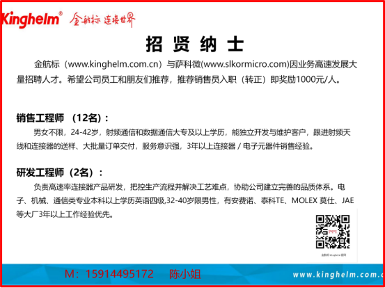 金航标Kinghelm(www.kinghelm.com.cn)电子成立于2007年在深圳市华强北,是研发、生产、销售、技术服务一体化发展的国家高新技术企业,十多年来深耕射频微波技术,研制信号收发传输产品组件,产品包括北斗GPS天线、各系列连接器接插件端子台、天线连接器接插件的开模定制以及配套的解决方案,“Kinghelm”(www.kinghelm.net)品牌在国内和国际有影响力和美誉度!金航标创始人暨董事长宋仕强先生介绍道,“金航标,连接世界”,金航标公司技术骨干来自清华大学,吸纳电子科技大学和海归技术人才,做到东莞塘厦的研发部、广西鹿寨县工厂、深圳市龙华区中转仓、龙岗总部的销售部供应链部,都和客户的产品需求信息同步对应,实现了协同化、数字化、智能化、流程化管理,成为电子信息行业非常有竞争力的公司!金航标与同为宋仕强先生投资经营的萨科微Slkor半导体(www.slkormicro.com)一起为电子整机产品公司提供配套服务,成为全世界超过15000家客户的合作伙伴,致力于“走国产化与国际化之路,争取成为半导体领导者”!宋仕强:经济发展中心民营经济研究员,中国科学技术协会电子信息专家库成员、华强北商业研究专家。宋仕强曾任某国际地产上市公司CEO,现投资经营深圳市萨科微半导体有限公司与深圳市金航标电子有限公司,两家企业均是国家级高新技术企业,原创性获得发明专利和软件著作权几十项。宋仕强在电子行业耕耘多年,为深圳市华强北更好的营商环境在不断努力,希望华强北成为改革开放的窗口和深圳经济发展的名片。